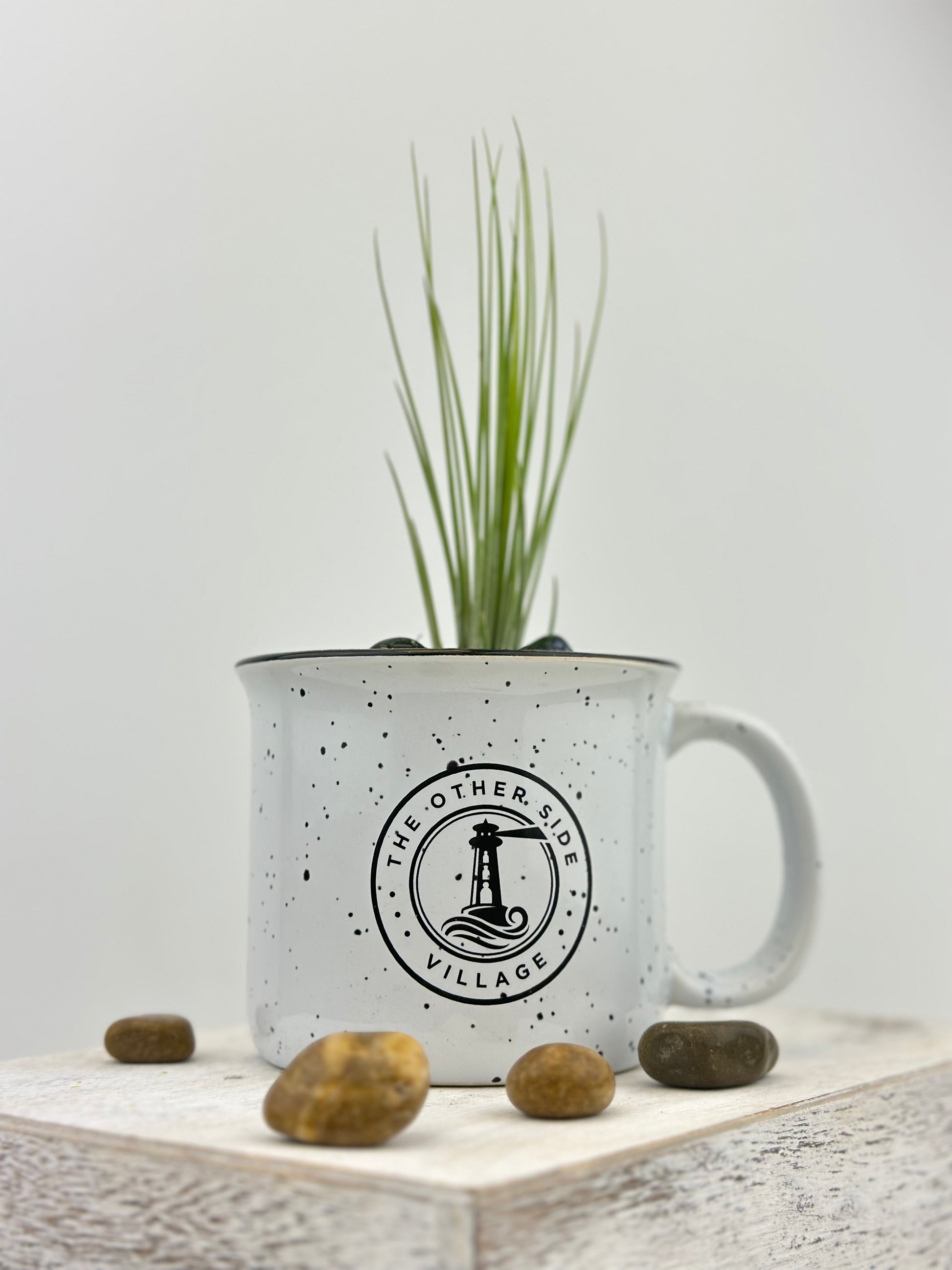The "The Other Side Village" branded coffee mug turned air plant pot is a unique and sustainable addition to any home or office. This repurposed coffee mug features the iconic logo of The Other Side Village, a non-profit organization dedicated to providing shelter, food, and support for the homeless.